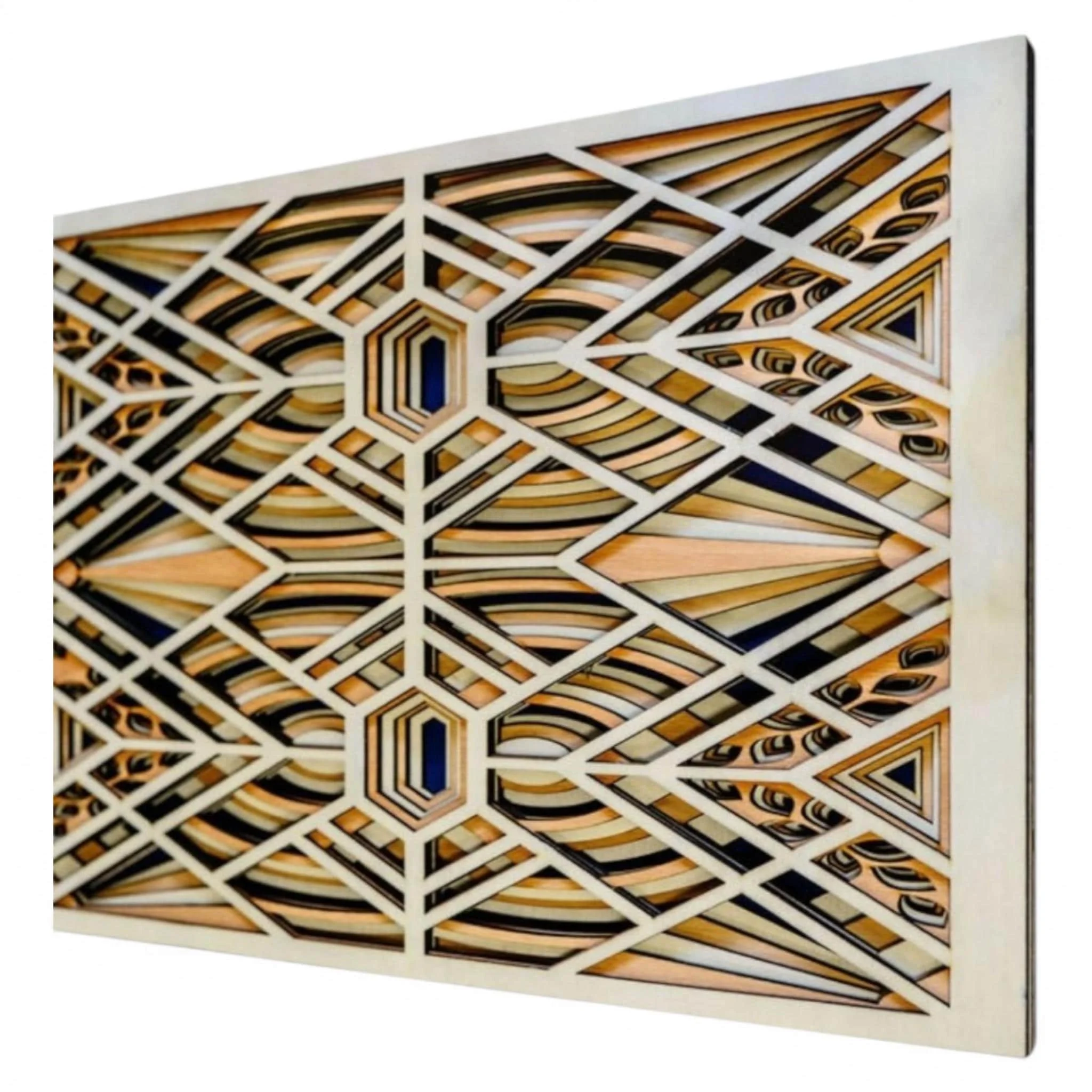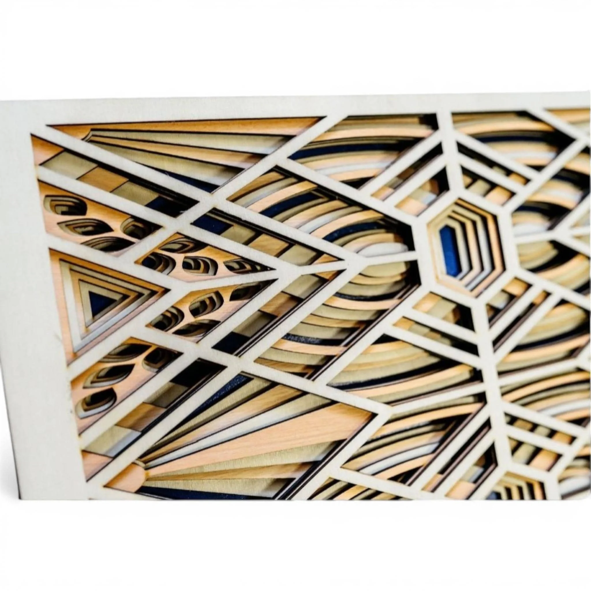 Add structure and sophistication to your space with this **geometric wood wall art**, handcrafted from **six precision laser-cut wood layers** for striking depth and symmetry. Inspired by Art Deco design, this piece features repeating geometric patterns and clean lines, blending natural wood tones with a bold dark blue backdrop for a modern yet timeless look.