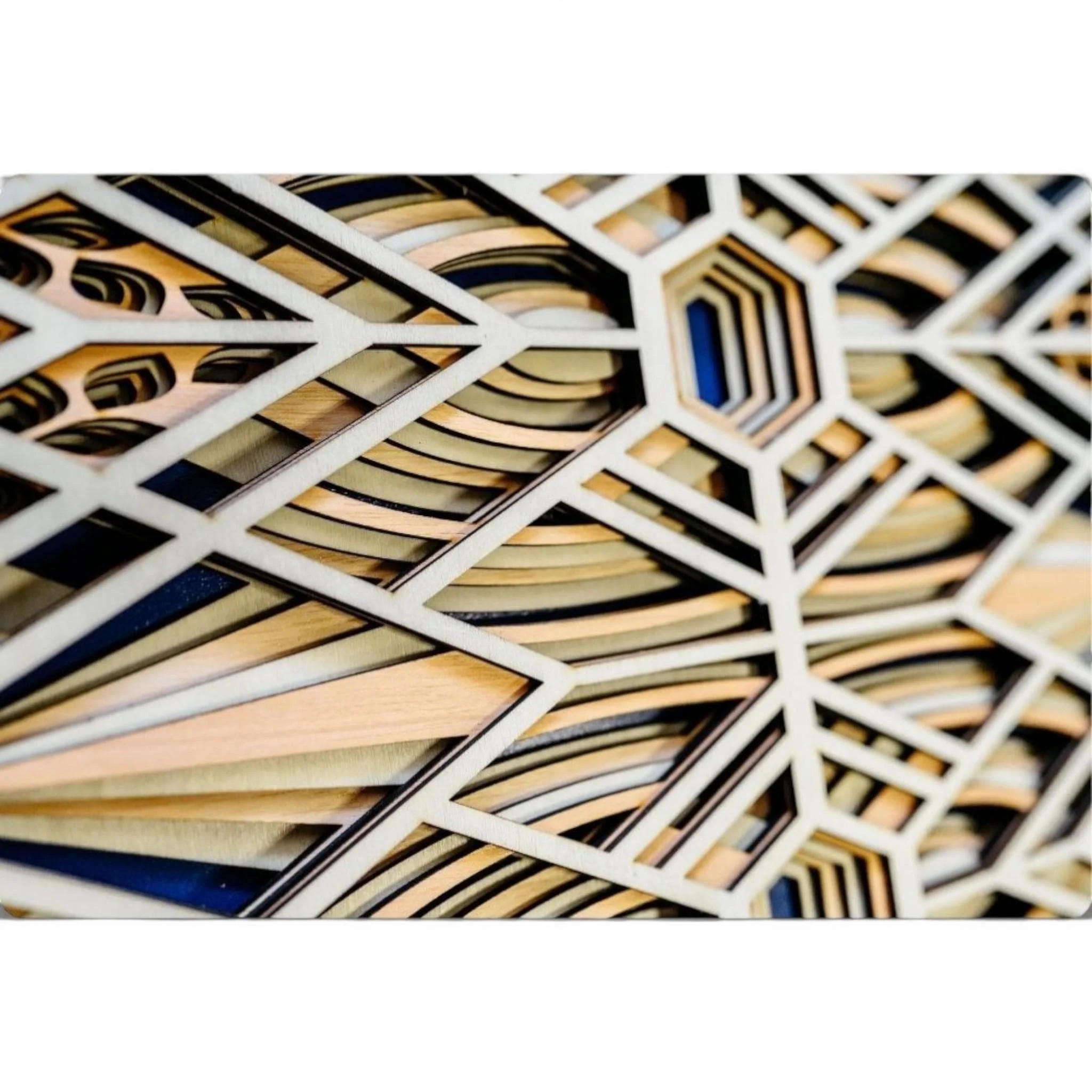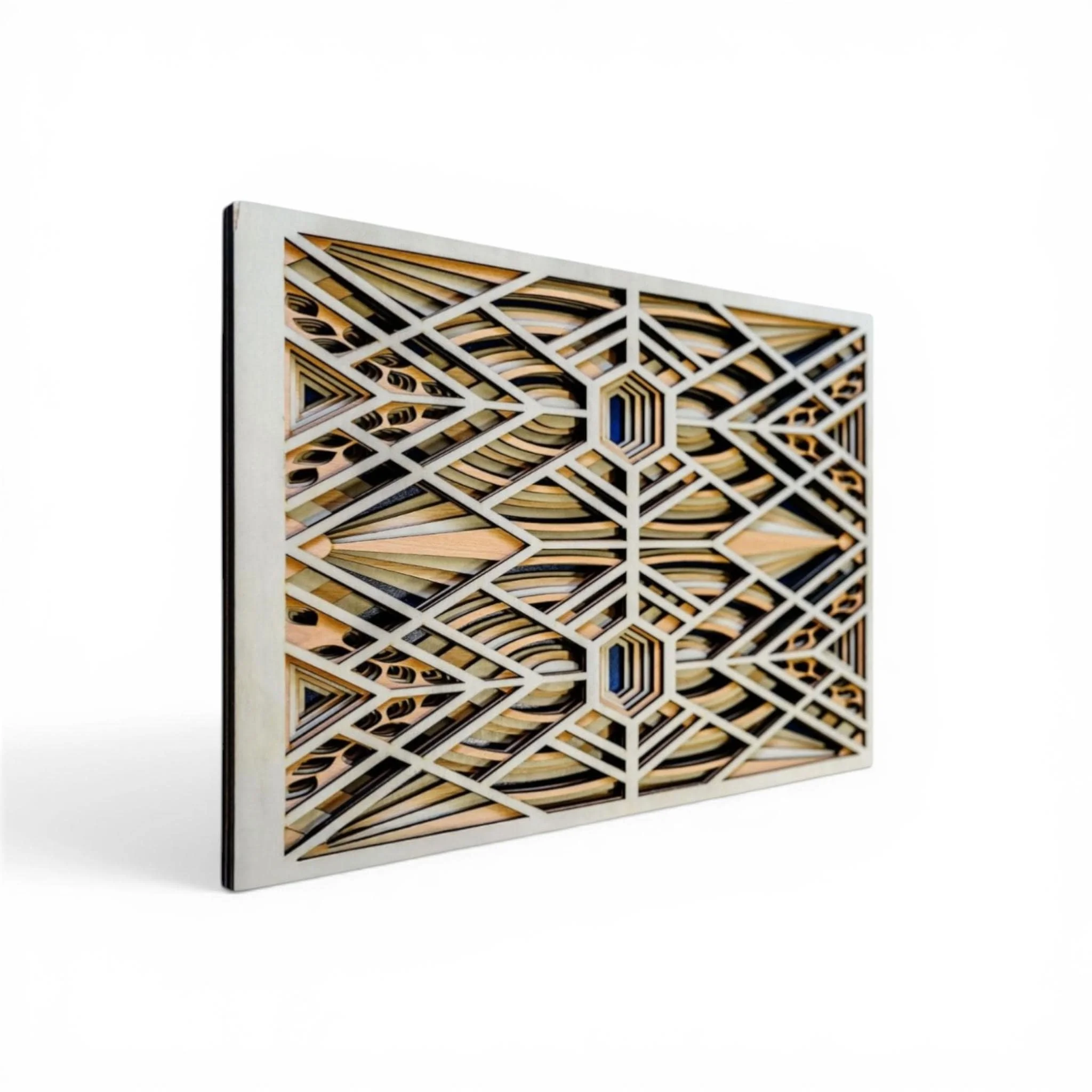 - Layers crafted from **poplar and cherry wood** - Back layer made from **dark blue plywood** - Precision laser-cut and hand-assembled for clean lines and depth