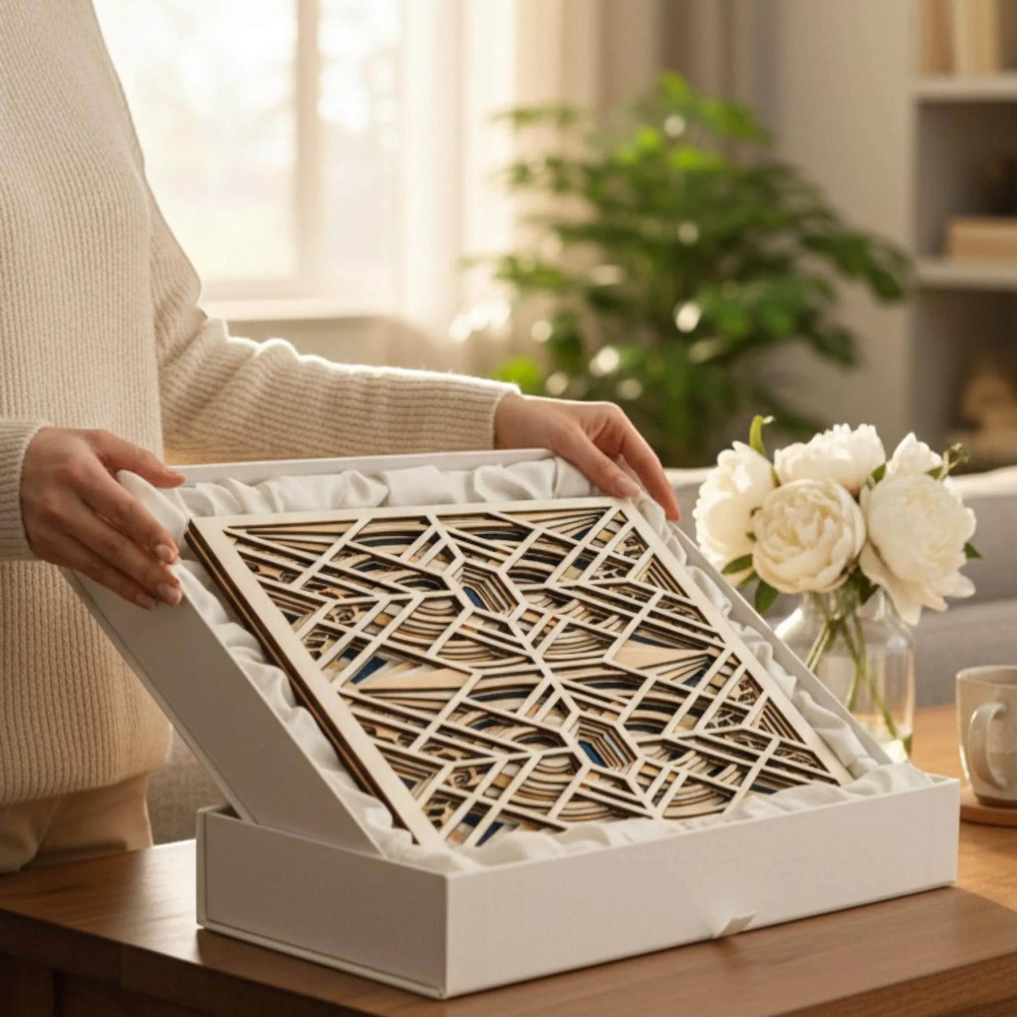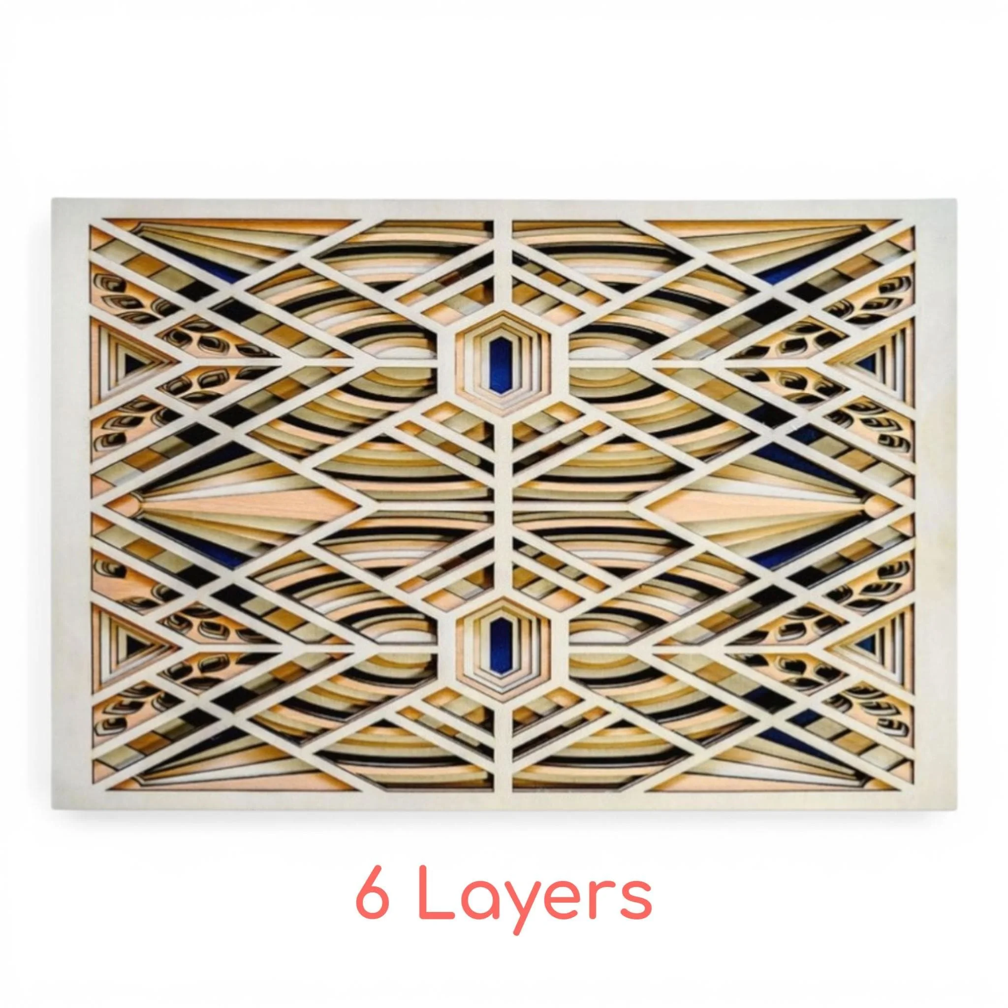 - 6-layer geometric wood wall art panel - Art Deco–inspired pattern with layered depth - Precision laser-cut design with strong visual structure