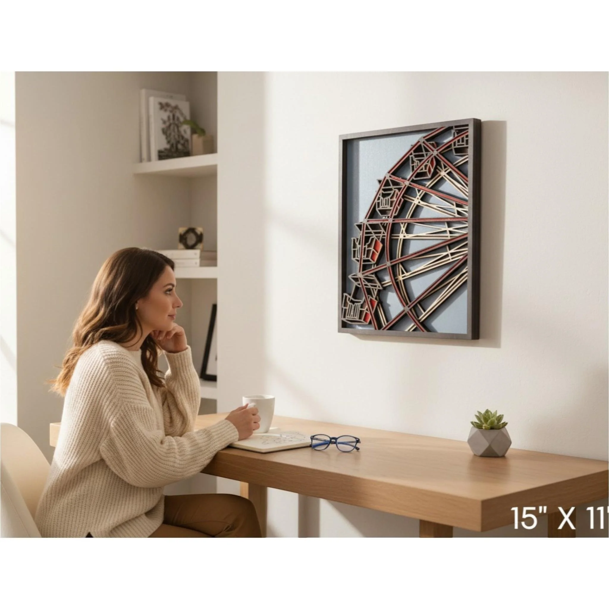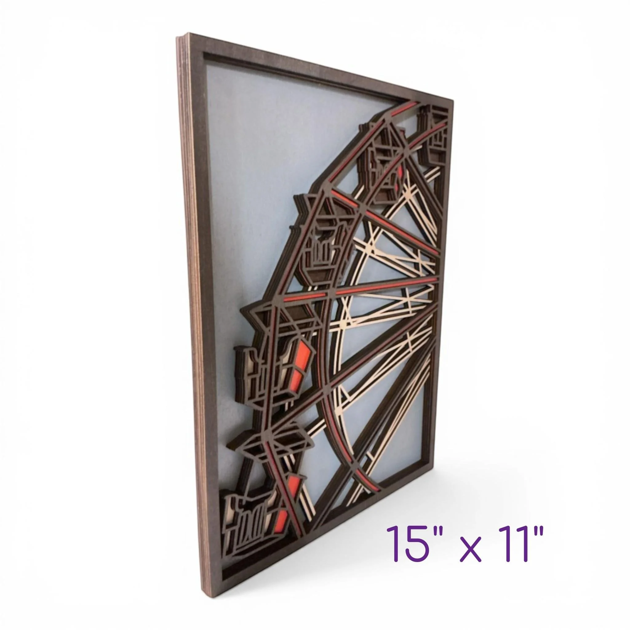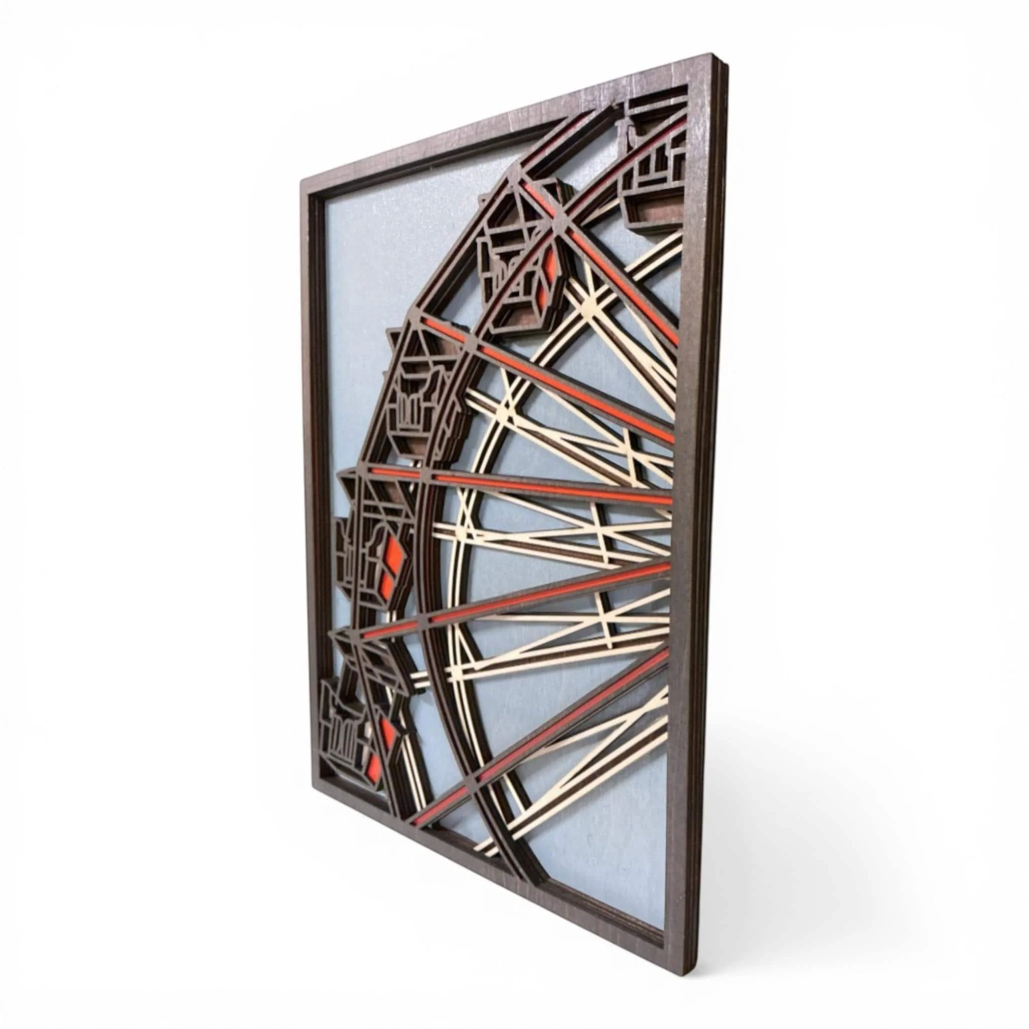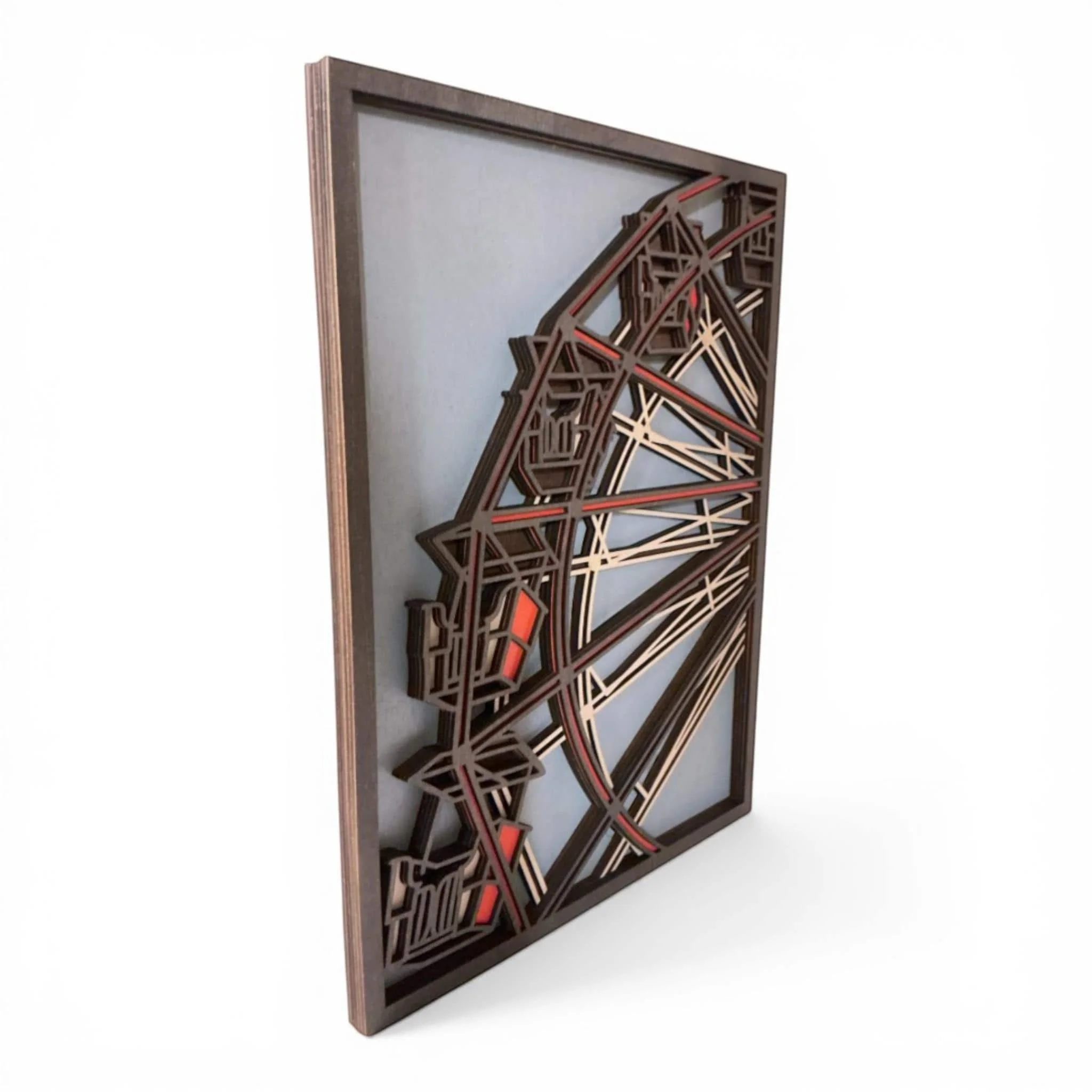 Layered wood ferris wheel art showcasing a detailed architectural design with dimensional layers for depth and visual impact. This handcrafted piece blends structure and artistry, making it a standout addition to any space.